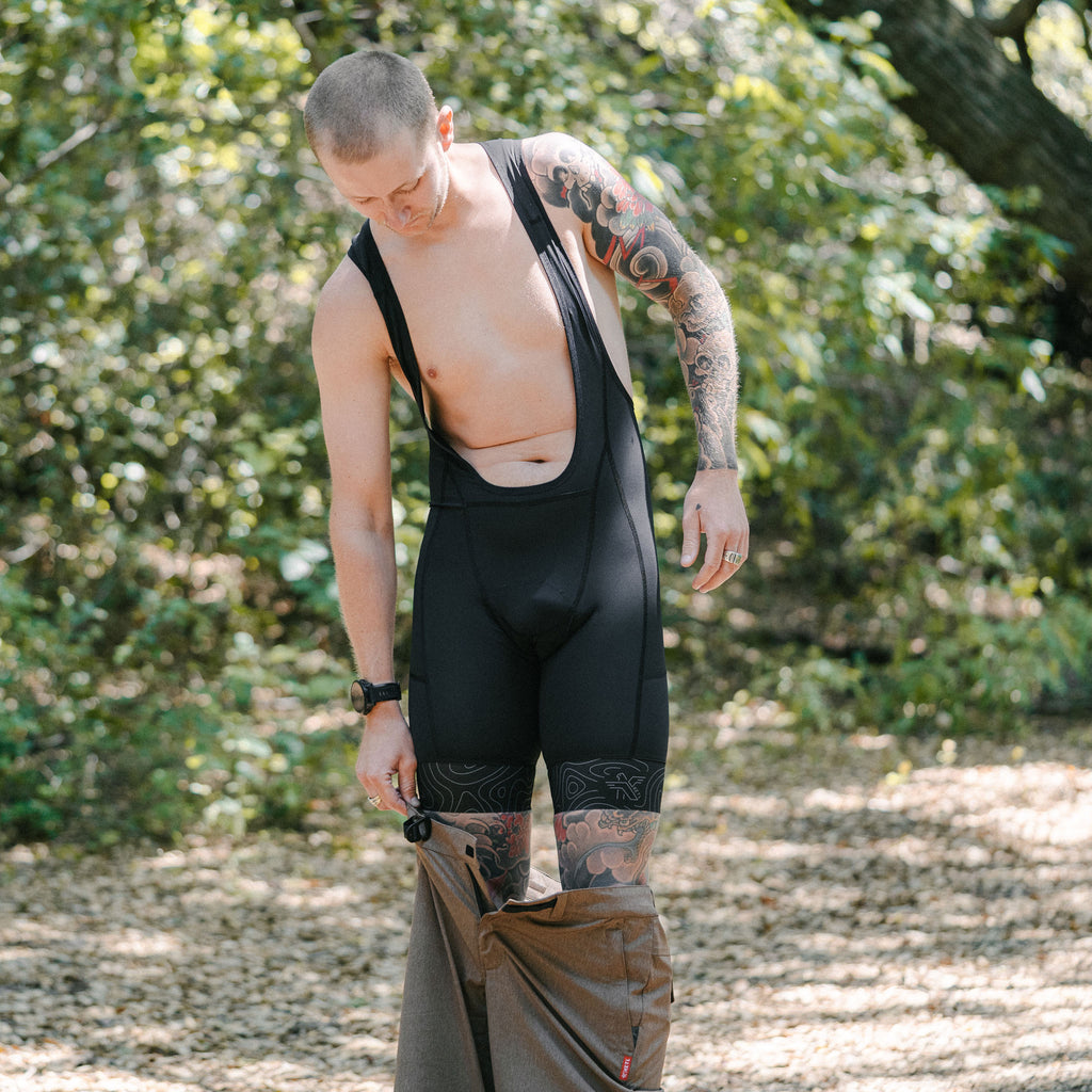 At the core of any efficient mountain biking kit is a basic liner bib - our MTB bib is anything but basic. Featuring an Italian made quadruple layer chamois and crafted using lightweight, breathable materials, our cycling bib is designed to be worn under an overshort and provide just the right amount of compression without being constricting. The mesh back design keeps air moving and moisture at bay. Triple pockets provide ample space for your ride necessities like a water bottle, snacks, kazoos and tools while laying nicely over the waistband of your MTB shorts.